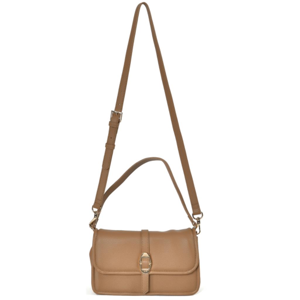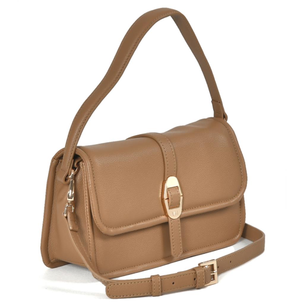Shoulder bag em PU soft touch. Alça de ombro fixa. Alça extra tiracolo de PU removível com ajuste de tamanho. Abertura com botão magnético. Peça forrada com bolsos internos sendo um de zíper. Peça principal de metal com logo via marte.