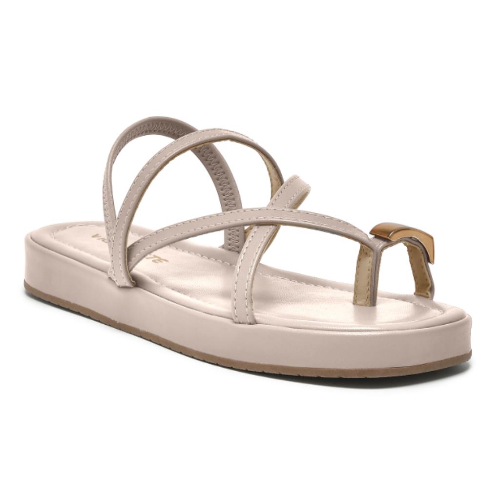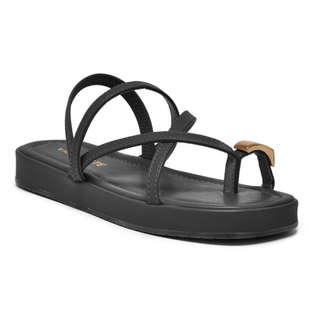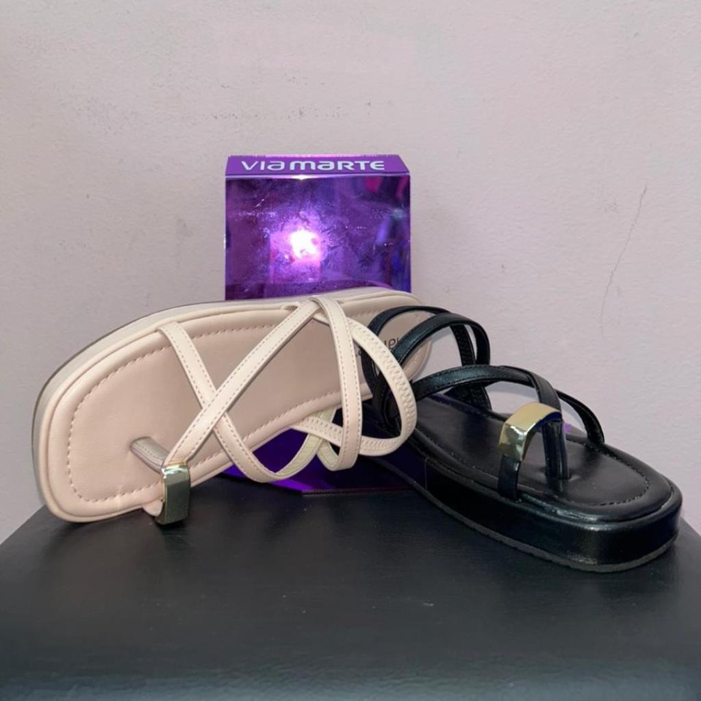 Sandália rasteira feminina Via Marte, com tiras delicadas e modernas, detalhe no dedão que adiciona um toque diferenciado ao design e solado baixo que garante conforto e praticidade.