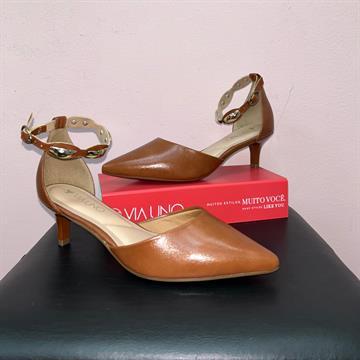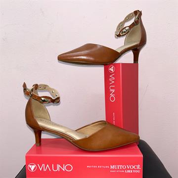 Bico fino e design clássico Salto médio confortável (aprox. 5 cm) Tira no tornozelo com acabamento em ilhós dourado e fivela metálica Estilo e segurança em um só modelo Ideal para diversas ocasiões